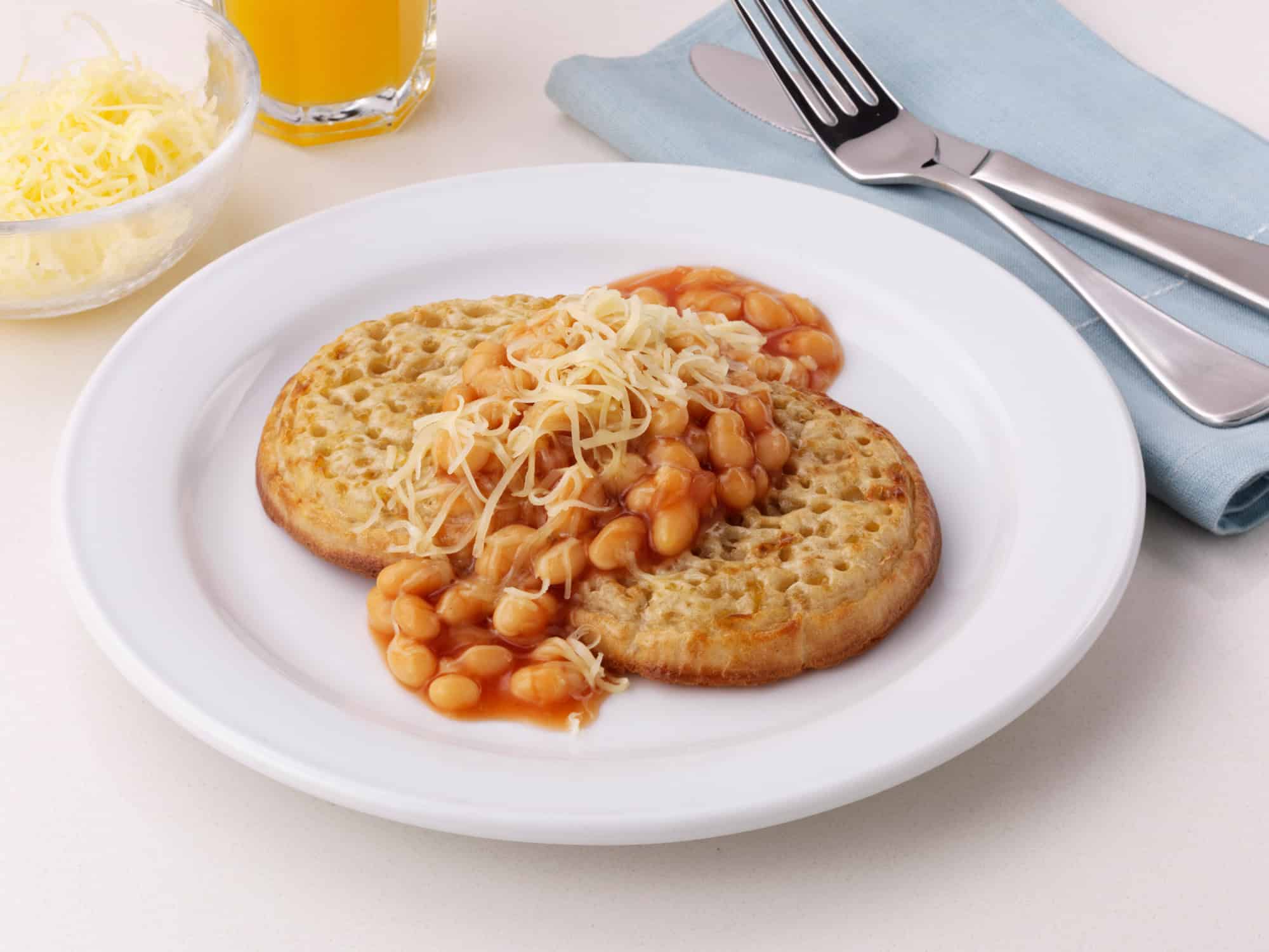 Cheesy Crumpet Rounds with Baked Beans! Golden Crumpets toasted and topped with melted cheddar and paired with, seasoned baked beans. Perfect afternoon delight!